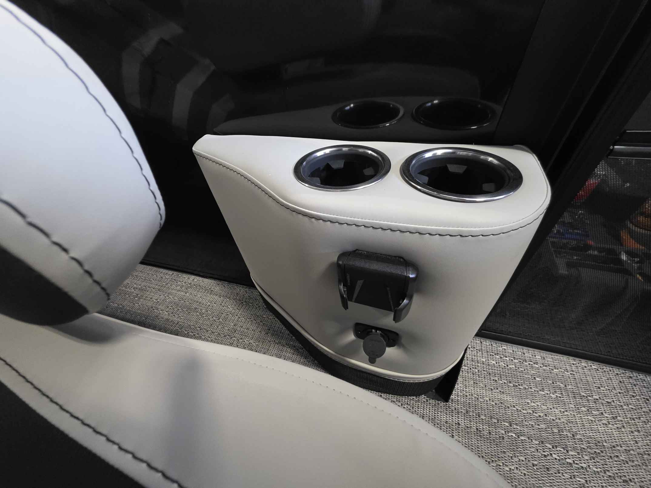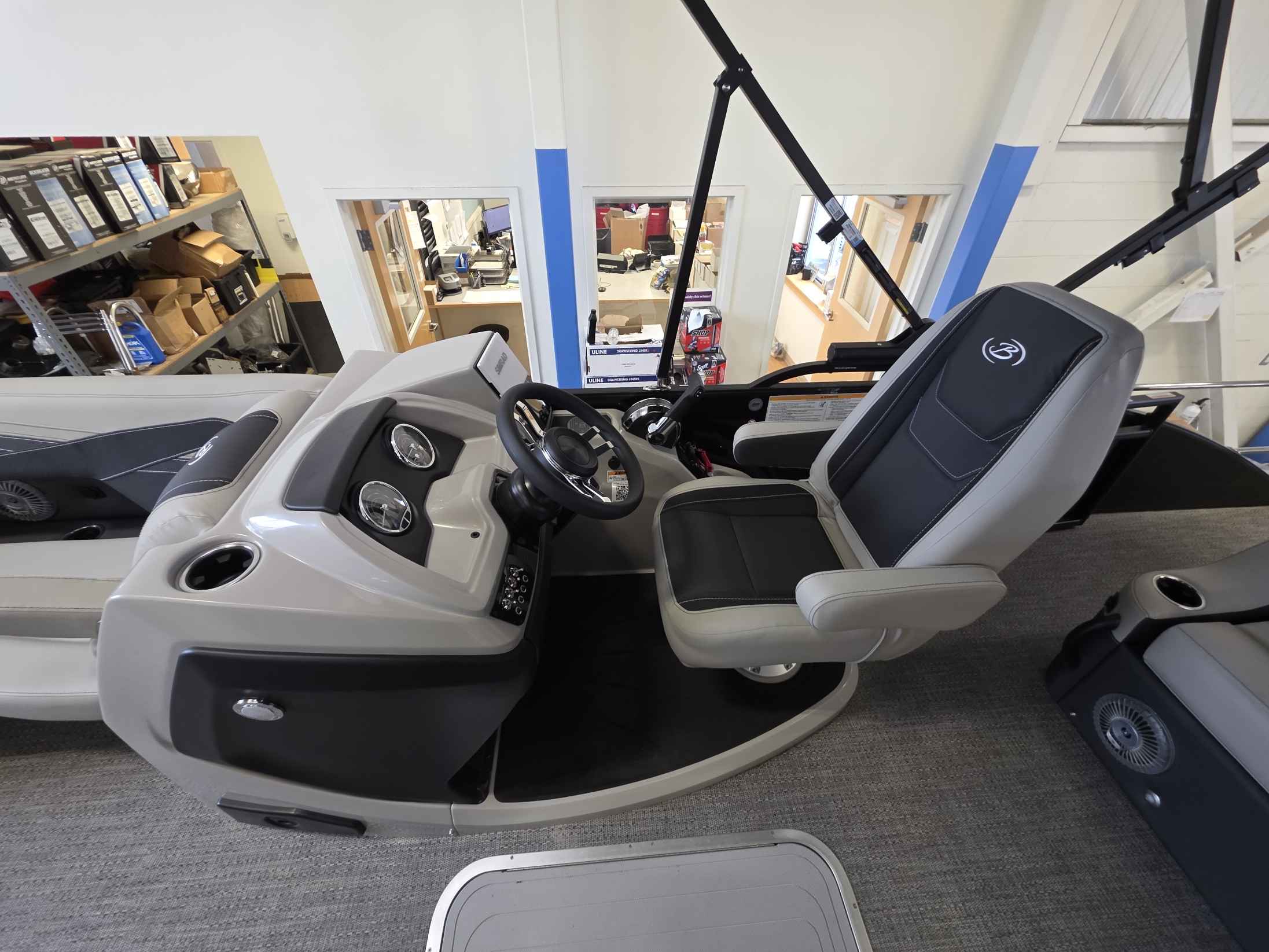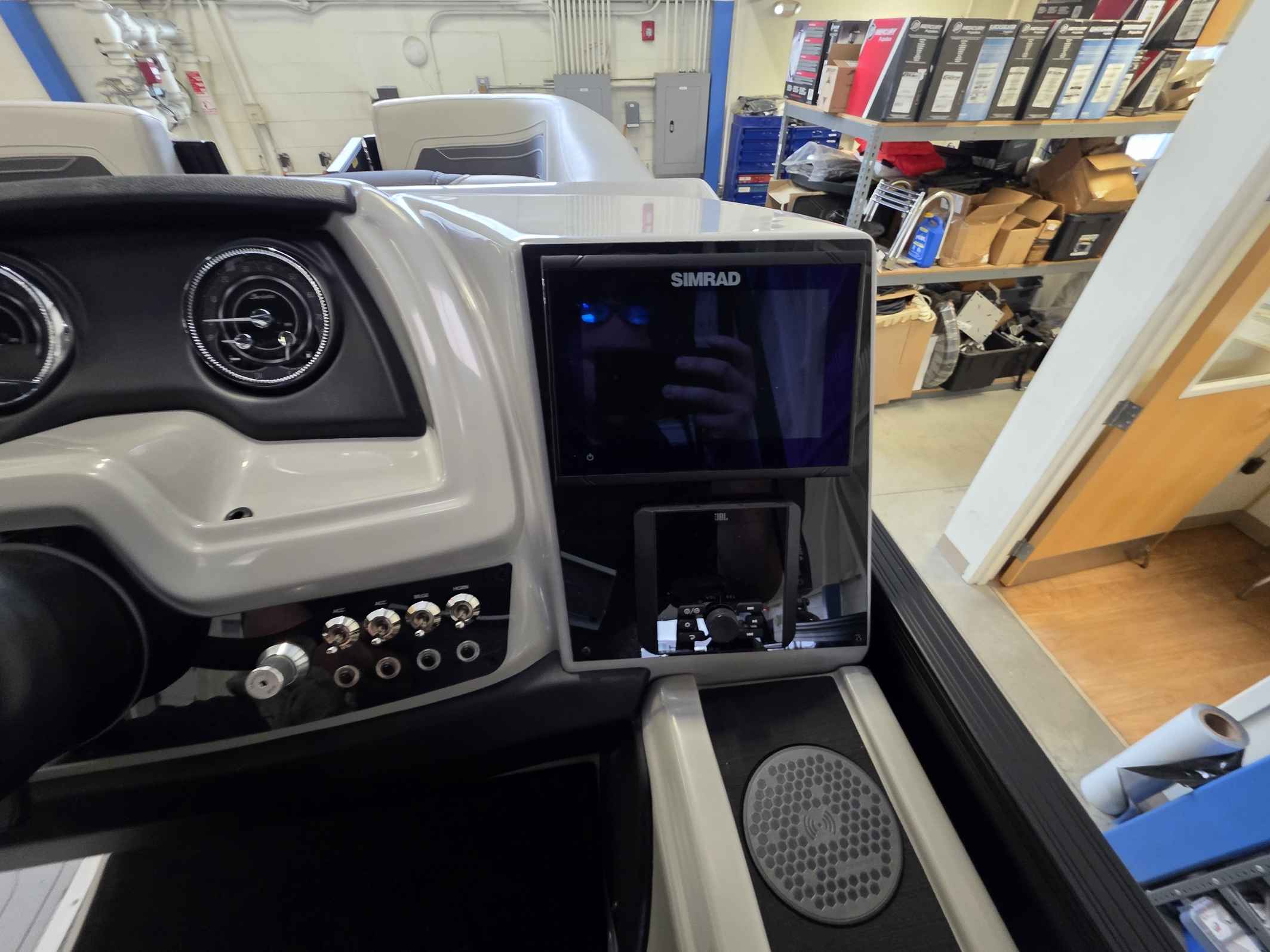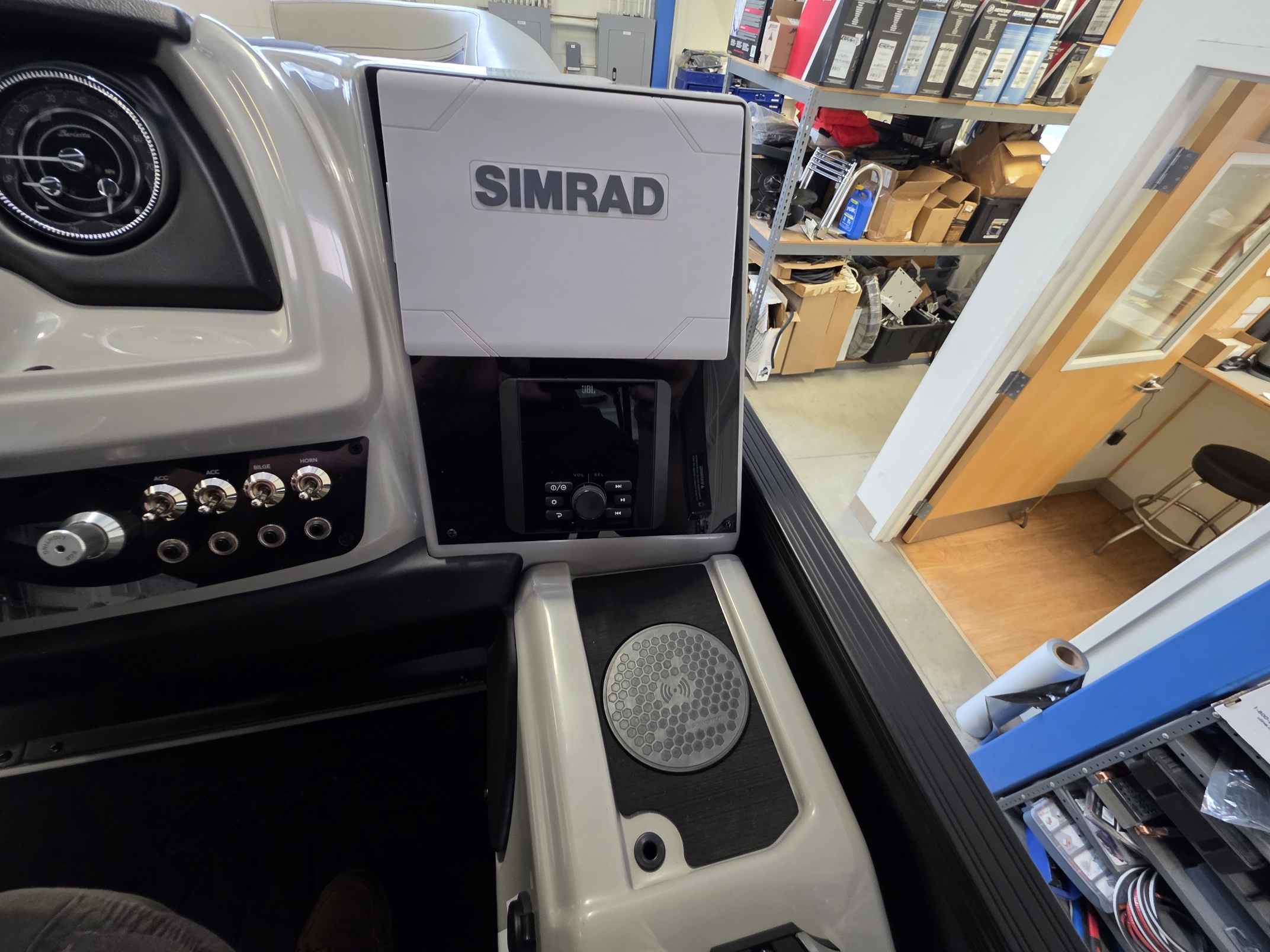 - Elevated Helm Experience: The raised helm platform, a best-in-class feature, provides excellent visibility for the captain and includes a premium steering wheel, a 7" Simrad touchscreen display with navigation, a wireless phone charger, and a comfortable high-back captain's chair.