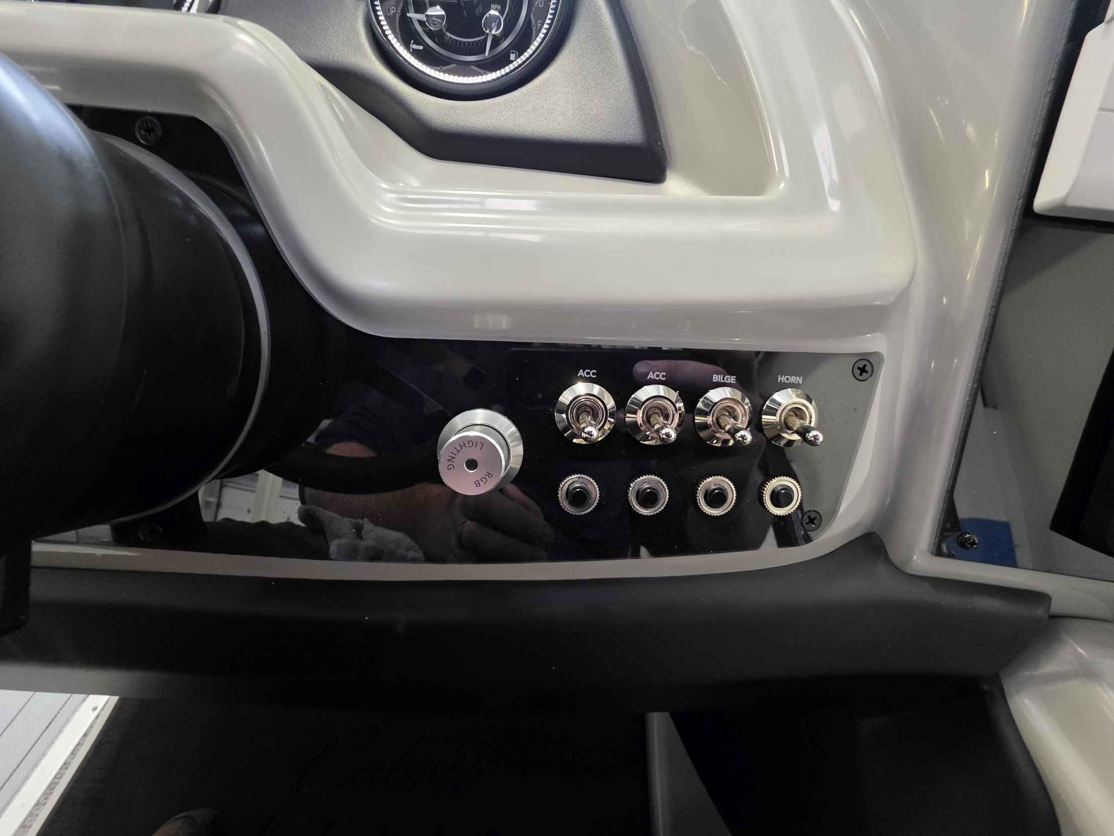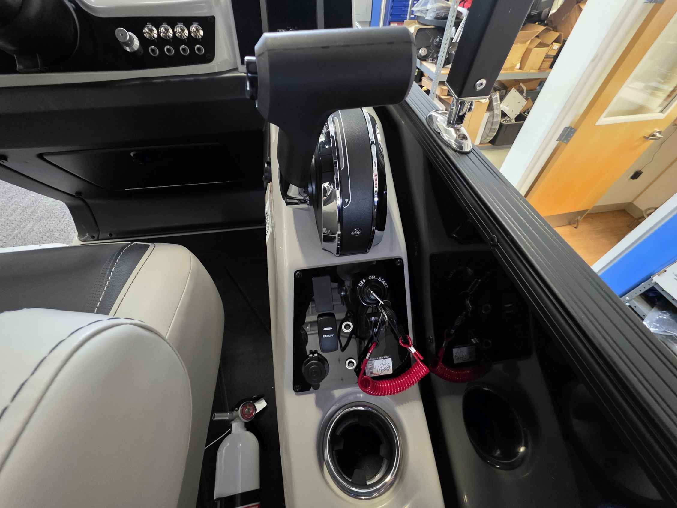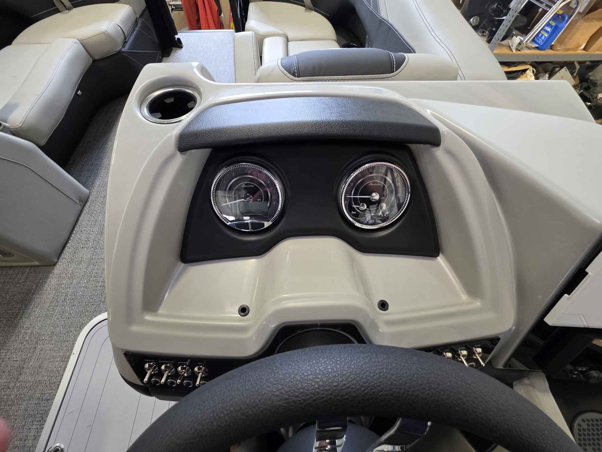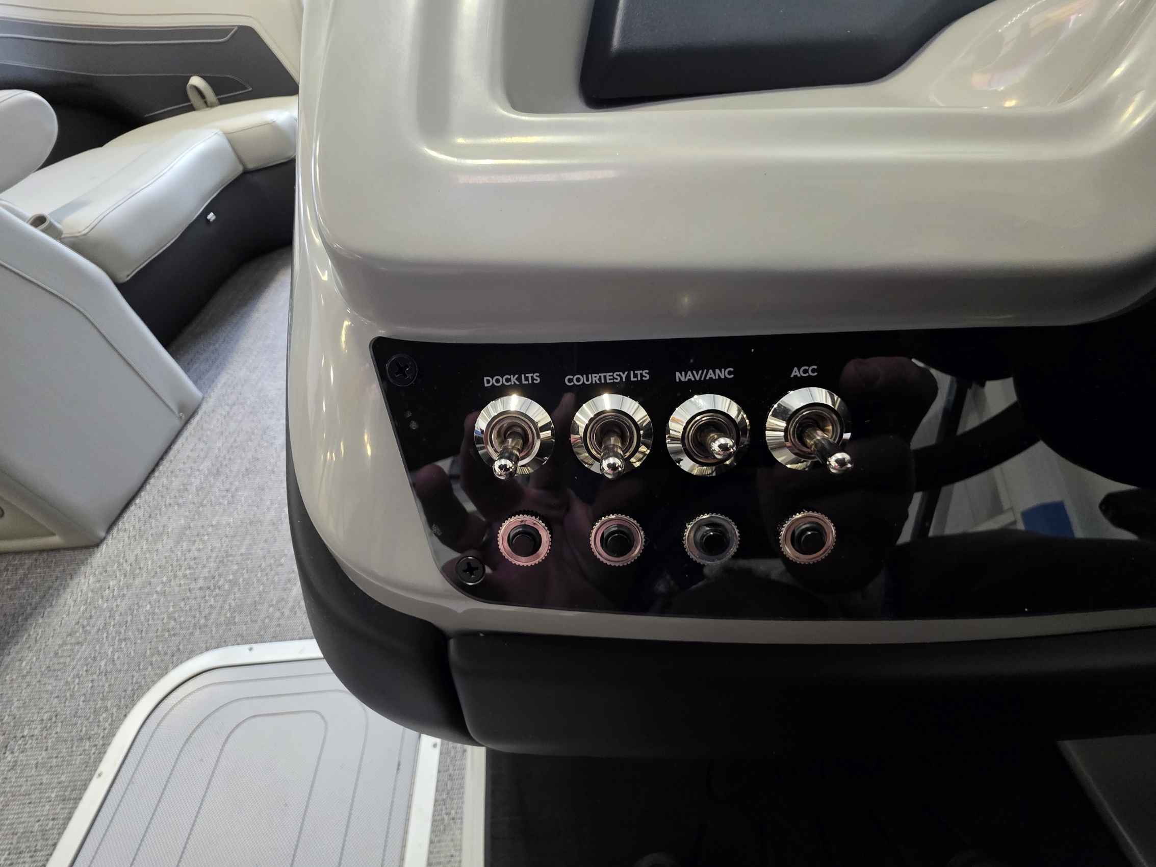 - Elevated Helm Experience: The raised helm platform, a best-in-class feature, provides excellent visibility for the captain and includes a premium steering wheel, a 7" Simrad touchscreen display with navigation, a wireless phone charger, and a comfortable high-back captain's chair.