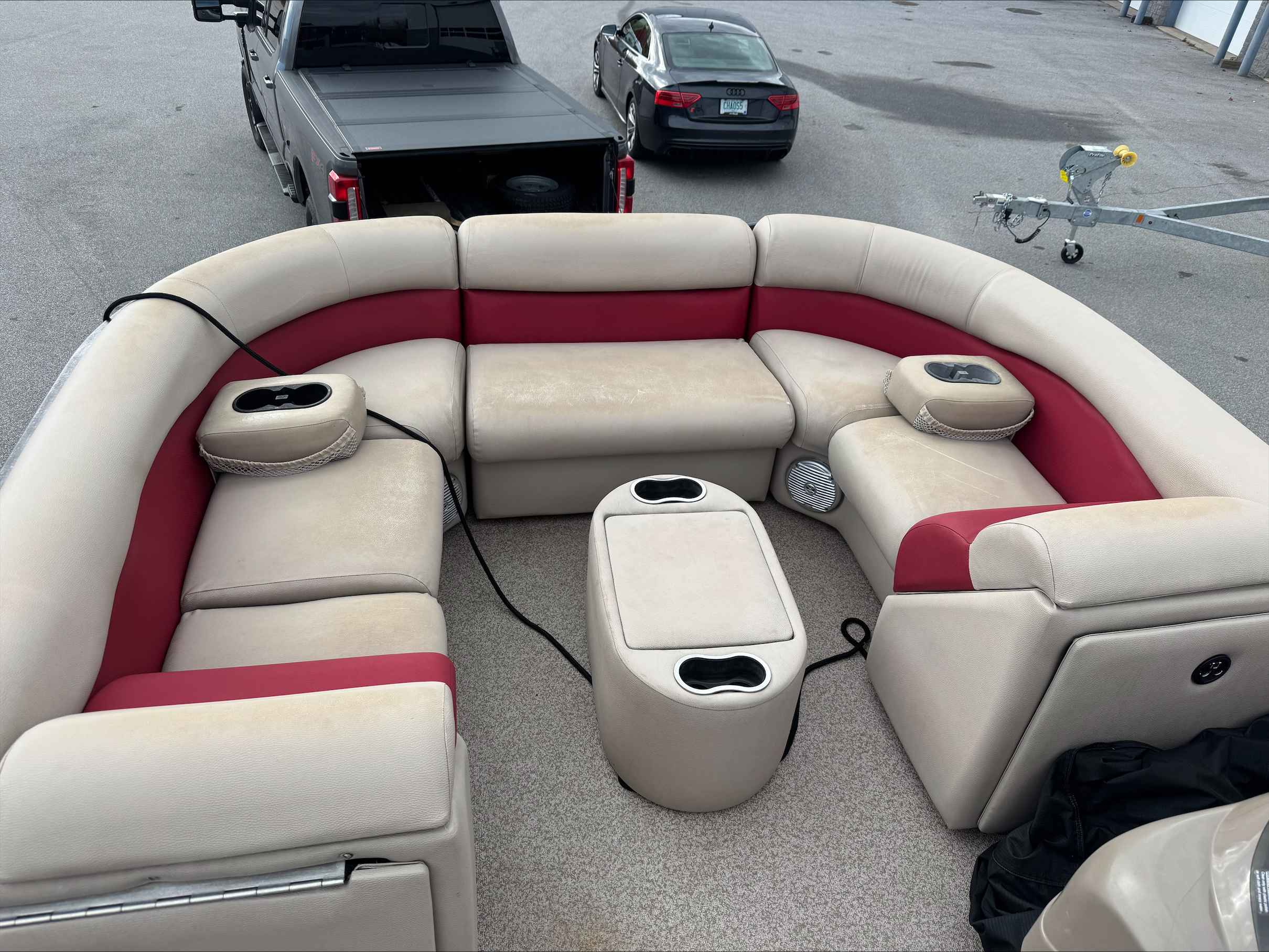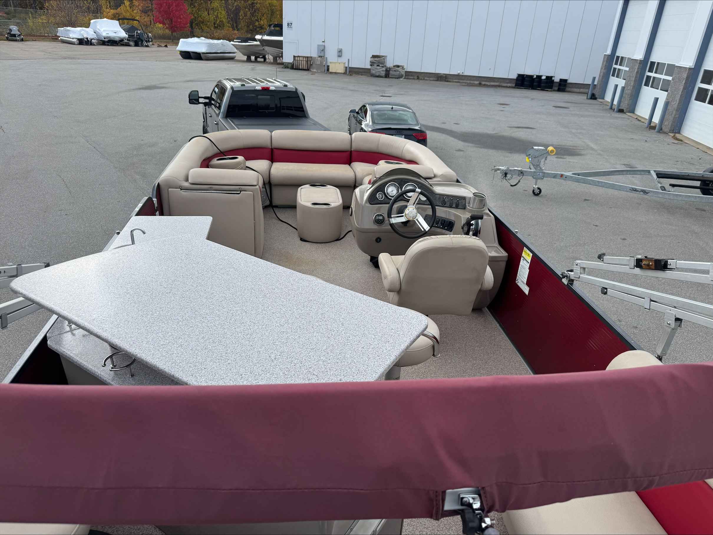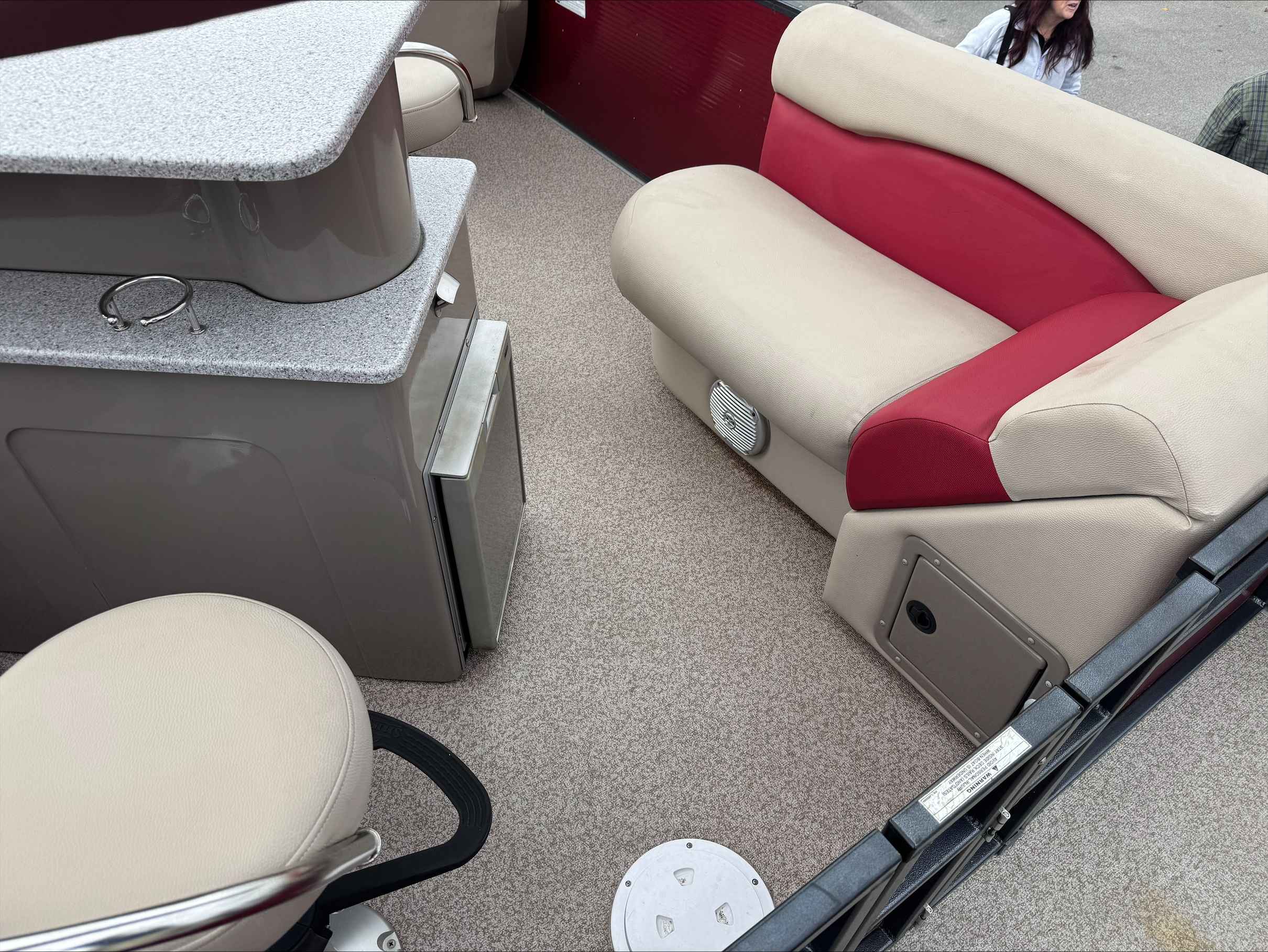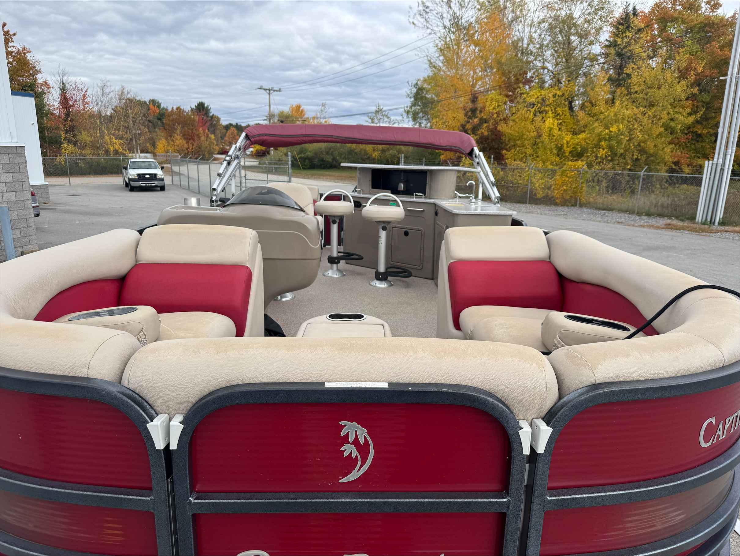 This 2015 Palm Beach 240, A pontoon with only 327 freshwater hours. Powered by a reliable Mercury 150 engine, it delivers smooth performance and efficient cruising on the water. The spacious layout offers plenty of room for family and friends, perfect for relaxing or entertaining. This boats layout with a bar area, refrigerator and this boat comes with a trailer. A great blend of comfort, style, and dependable power for your next adventure on the lake. Come check out this pontoon at Irwin Marine.